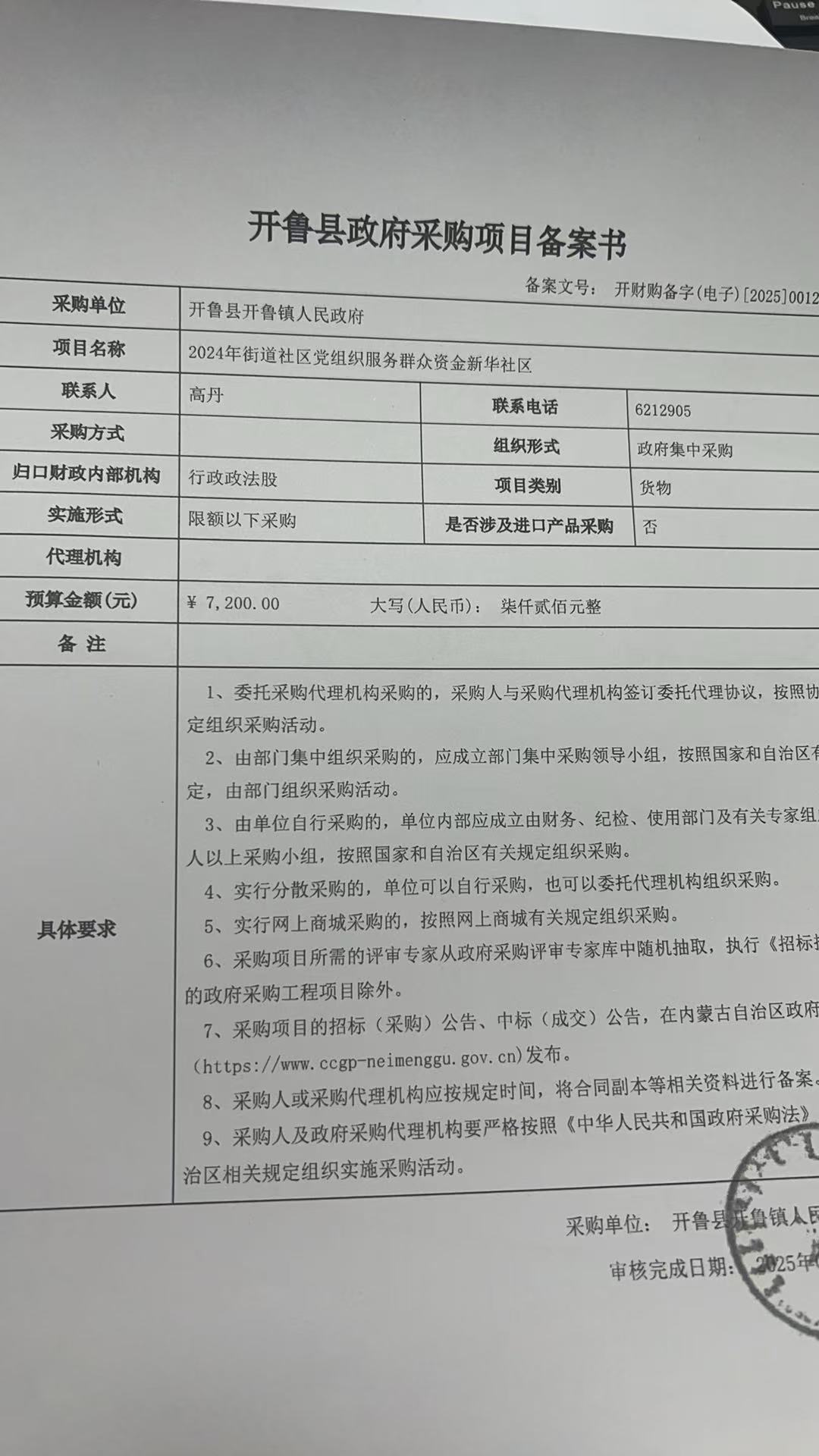 开鲁县开鲁镇人民政府2024年街道社区党组织服务群众资金新华社区政府采购合同公告